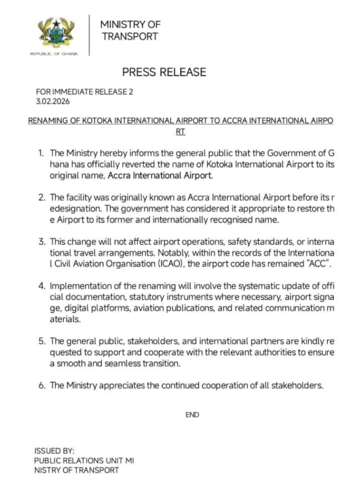 The Ministry of Transport in a Press Release yesterday, has announced that, Kotoka International Airport has now been officially renamed as Accra International Airport (its original name for that matter).